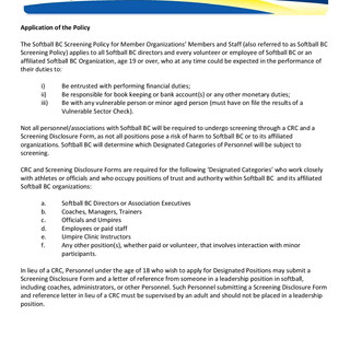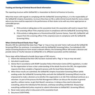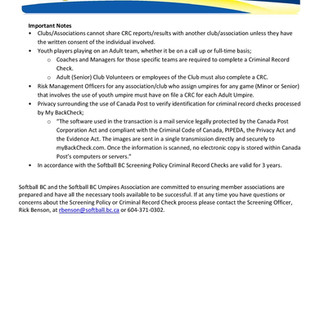 All umpires, age 18 and older, shall obtain a certified criminal record check and a vulnerable sector check, prior to umpiring any game, from the RCMP or a municipal police force and shall submit these record checks to the Board of Directors of Softball BC. The criminal record check and vulnerable sector check will be valid for duration of 3 years.